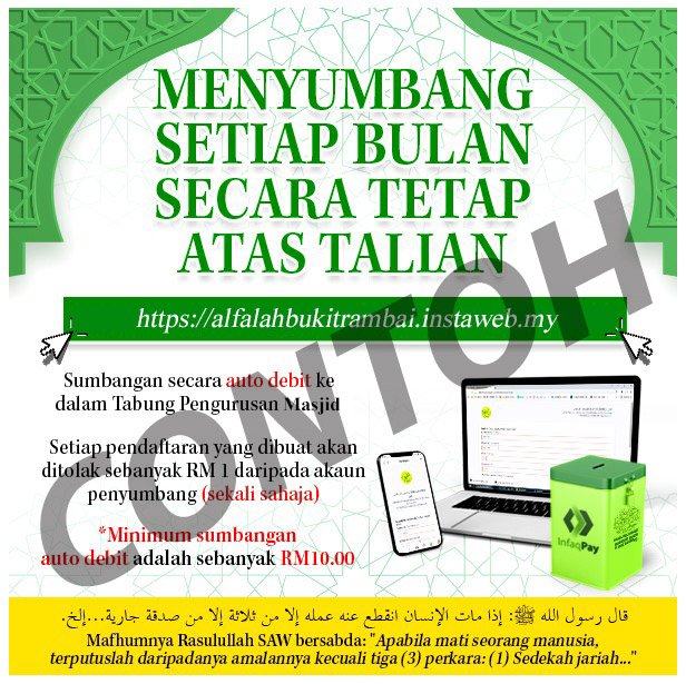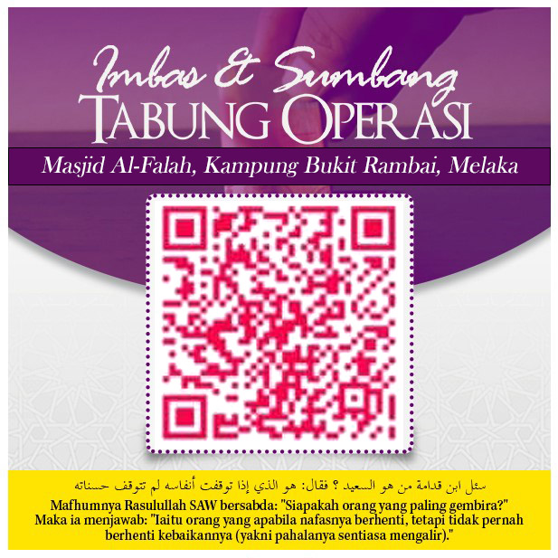Sumbangan ini bertujuan bagi menampung kos operasi Masjid Al-Falah, Kampung Bukit Rambai, Melaka seperti utiliti (elektrik/air/unifi), penyelenggaraan dan operasi, pembangunan, majlis ilmu online, aktiviti dan program pengimarahan di Masjid Al-Falah, Kampung Bukit Rambai, Melaka.